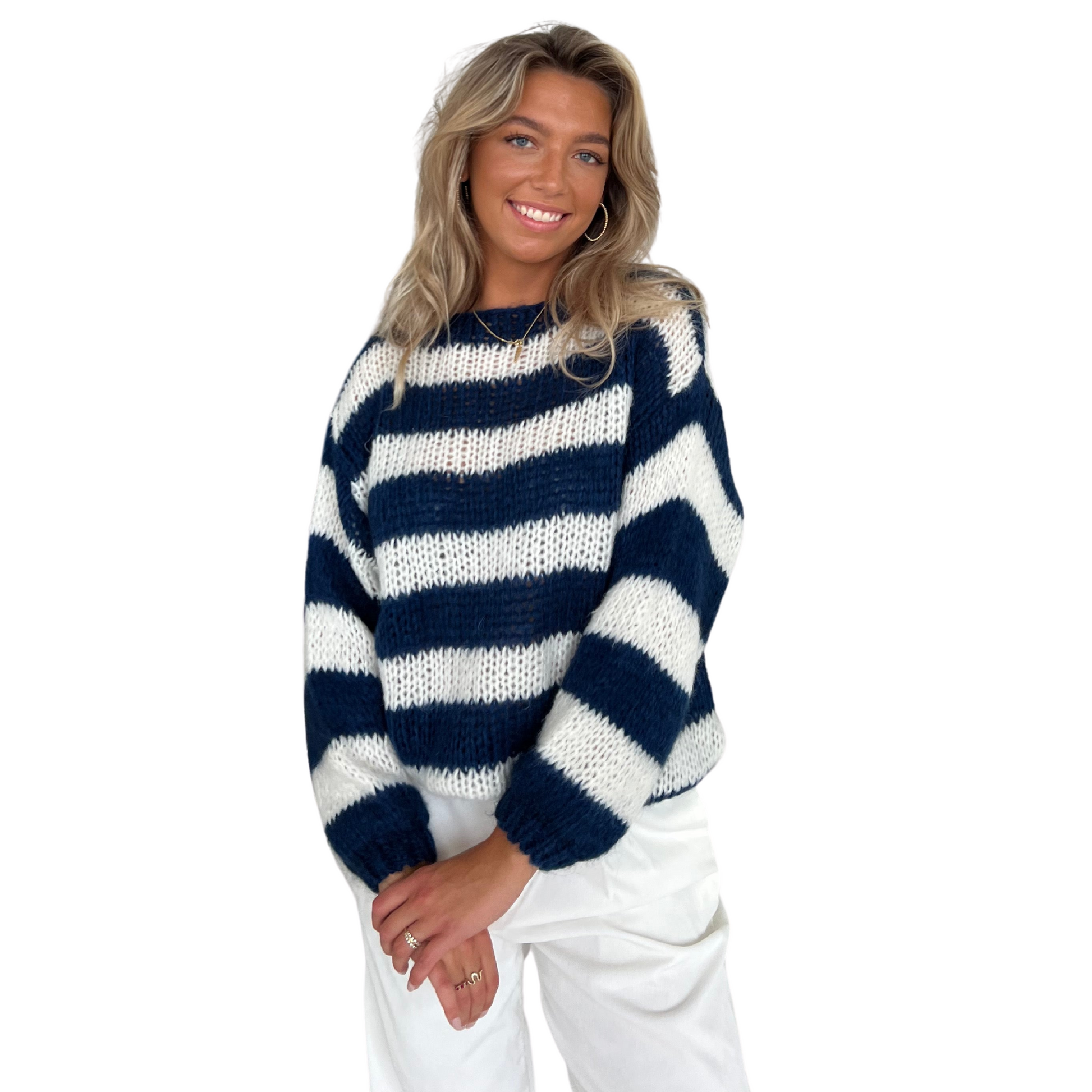 Deze oversized grof gebreide gestreepte sweater in navy blauw en wit geeft je direct die Scandinavische vibe waar je naar op zoek bent. De sweater heeft een losse en oversized pasvorm en is perfect voor alle seizoenen. De sweater heeft lange, brede mouwen en is ontworpen met een ronde halslijn. Bereid je voor op de koudere maanden met trendy & cozy Scandinavische look!