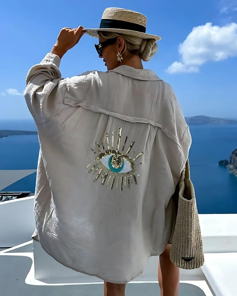 Geef je look een unieke touch met de Viyomé™ blouse – een luchtig zomeritem dat stijl, betekenis en zelfexpressie samenbrengt. De oversized pasvorm zorgt voor ultiem draagcomfort, terwijl het met pailletten en parels geborduurde oogmotief op de rug symbool staat voor helderheid, intuïtie en kracht.
